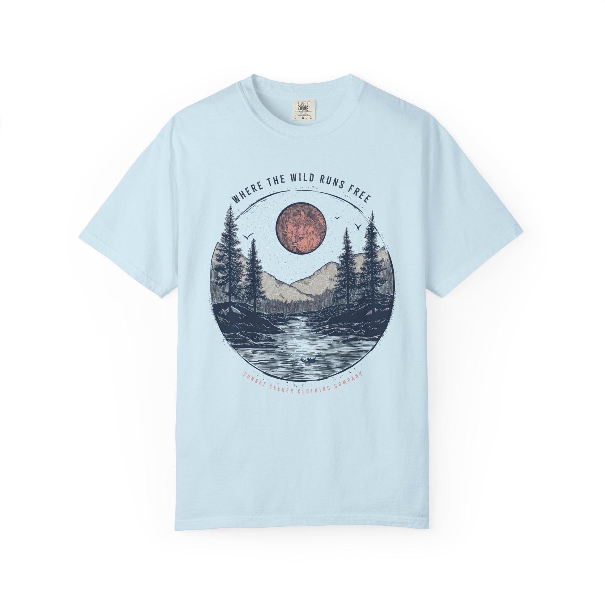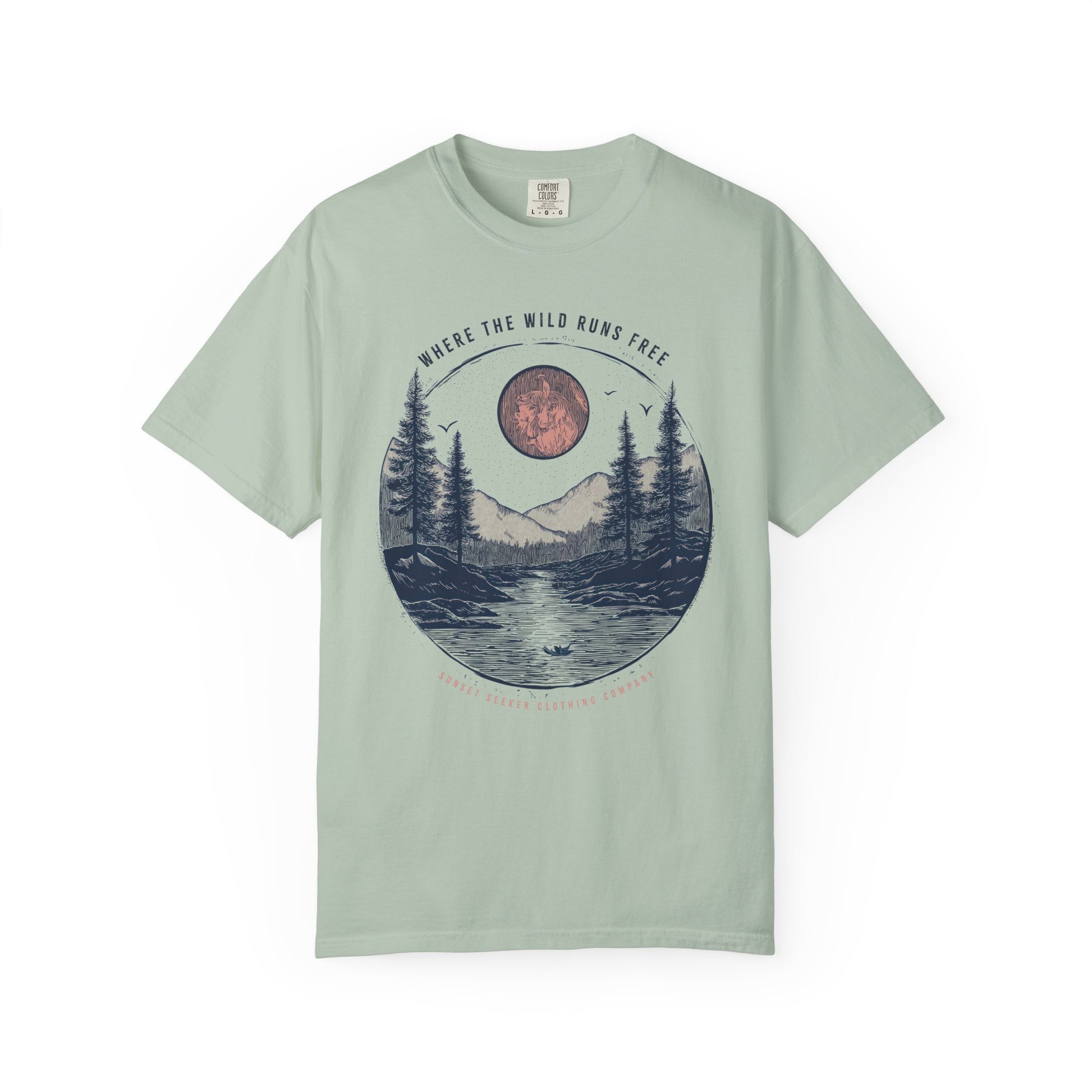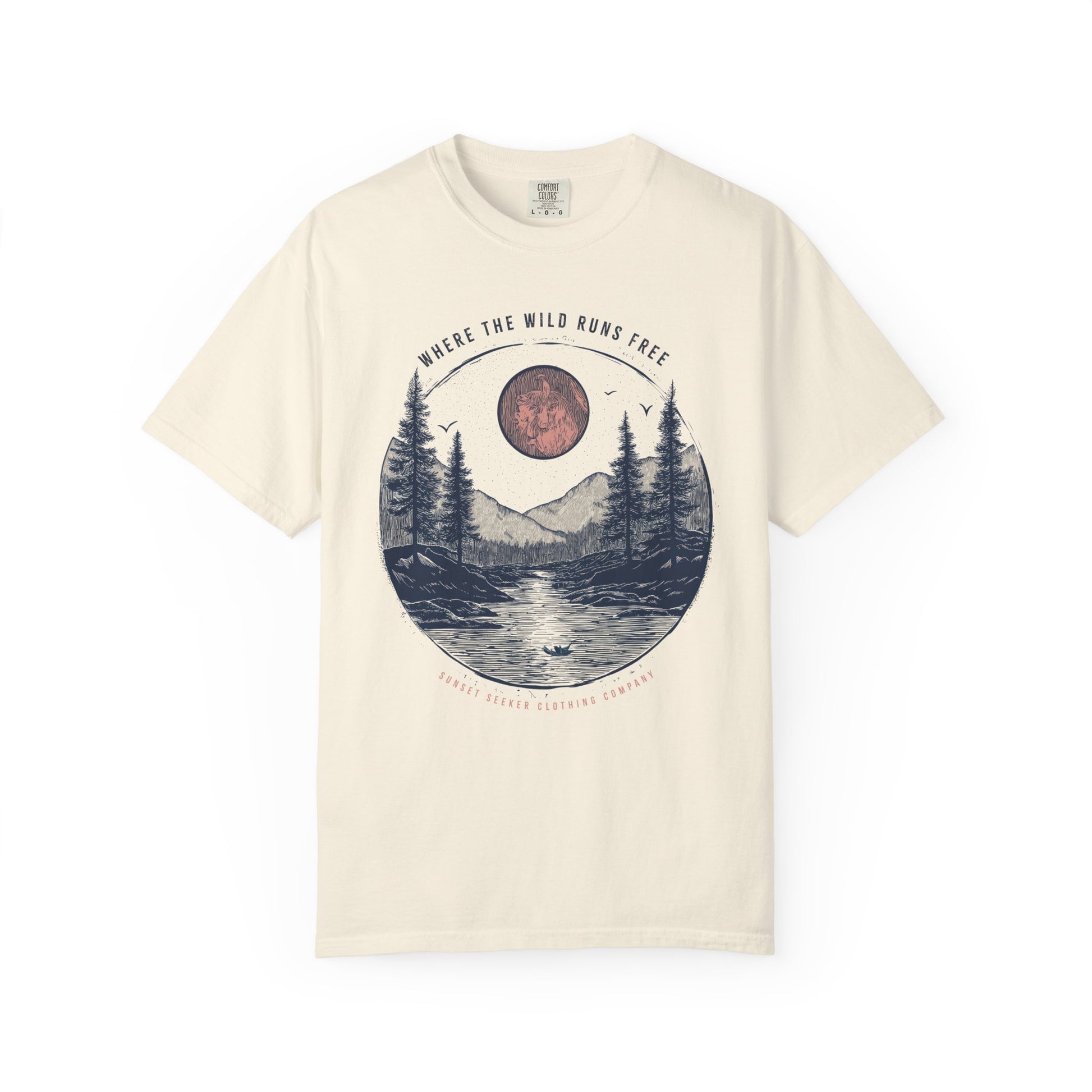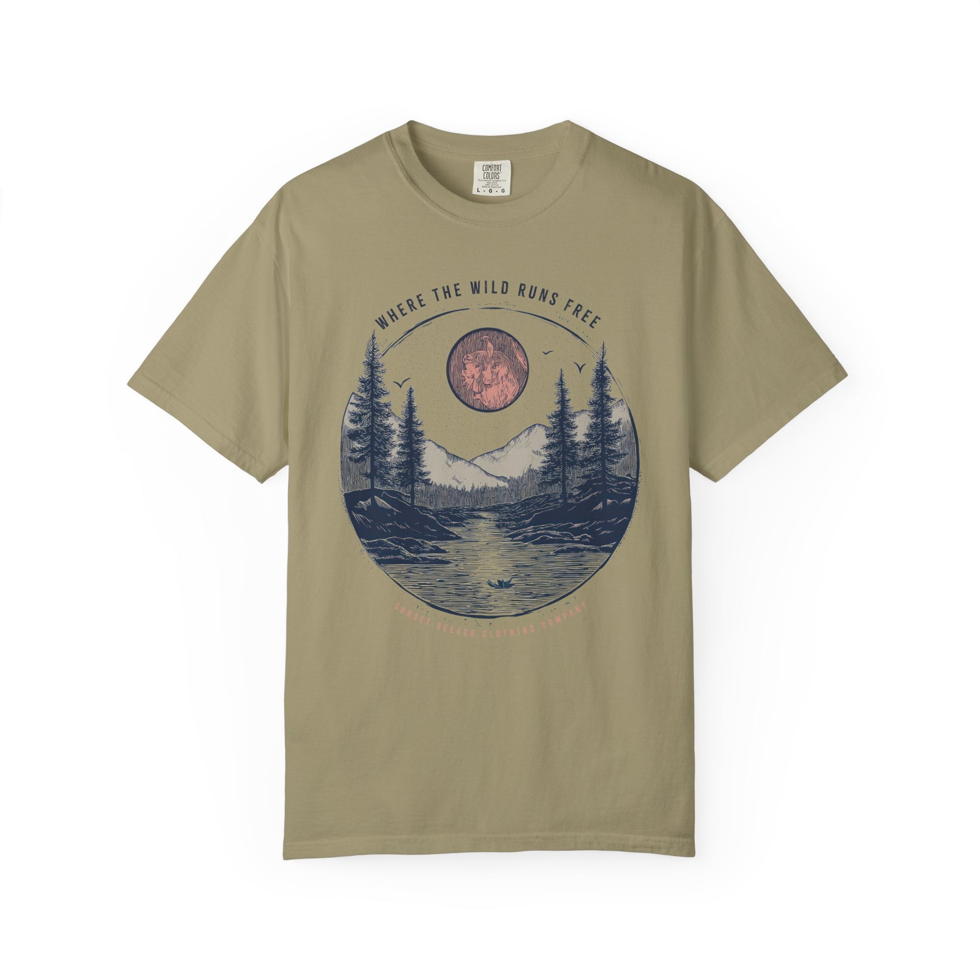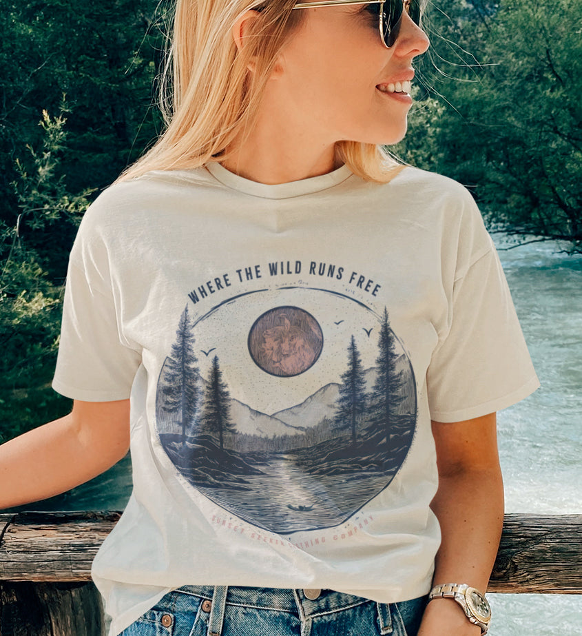 This hand-drawn design captures a serene wilderness under a quiet moon, where a still lake reflects the timeless beauty of forest and mountain. With raw linework and a weathered finish, Where The Wild Runs Free is a tribute to untamed places and the spirits that roam them.